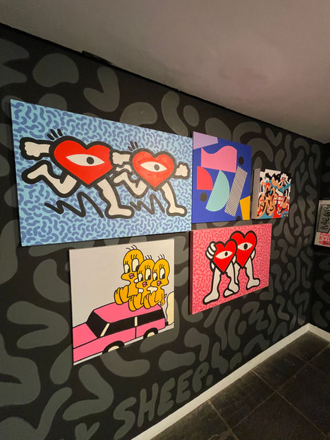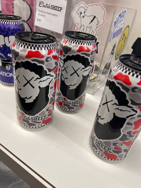 We transformed the space into a fully branded Electrik Sheep pop-up — walls covered in our trademark stencil graphics, bold typography, and flashes of irreverent design. The store became a living continuation of the exhibition: part gallery, part street-wear hub, packed with limited-edition art prints, tees, accessories, and original works from the show’s artists.